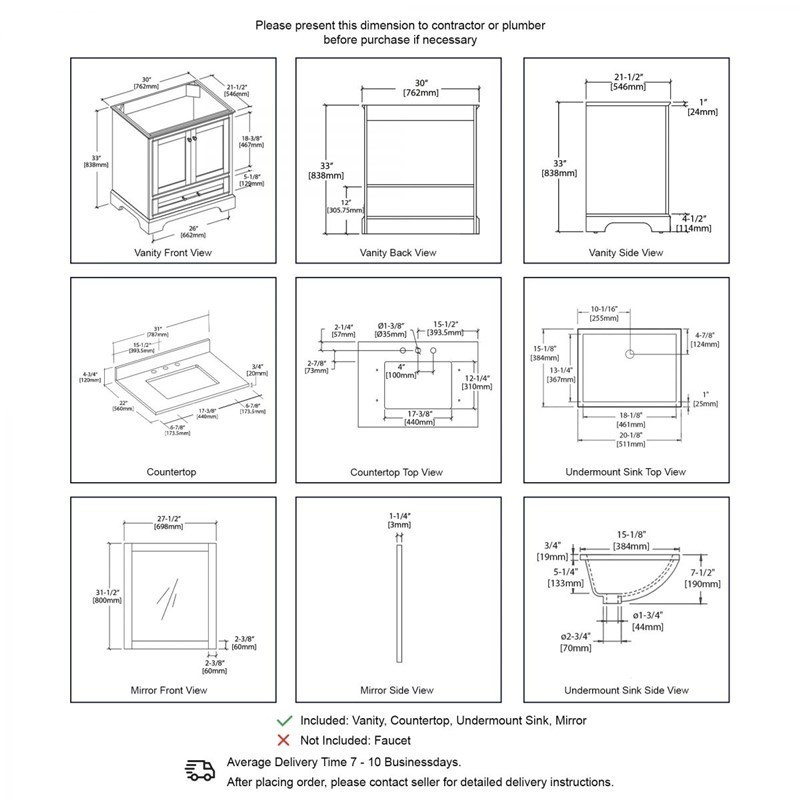 Vanity: 30 Inch (W) x 21 1/2 Inch (D) x 33 Inch (H)