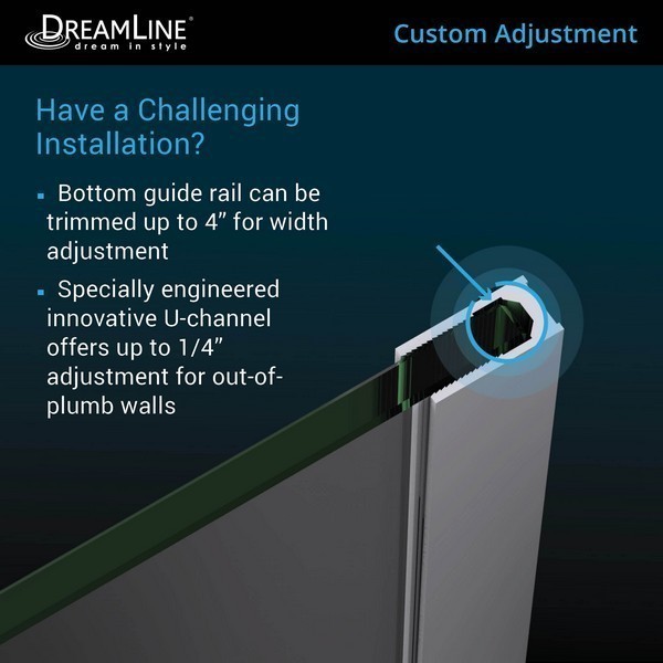 U-channel allows up to 3/8 in. of adjustment for out-of-plumb (uneven walls) on Stationary Panel side