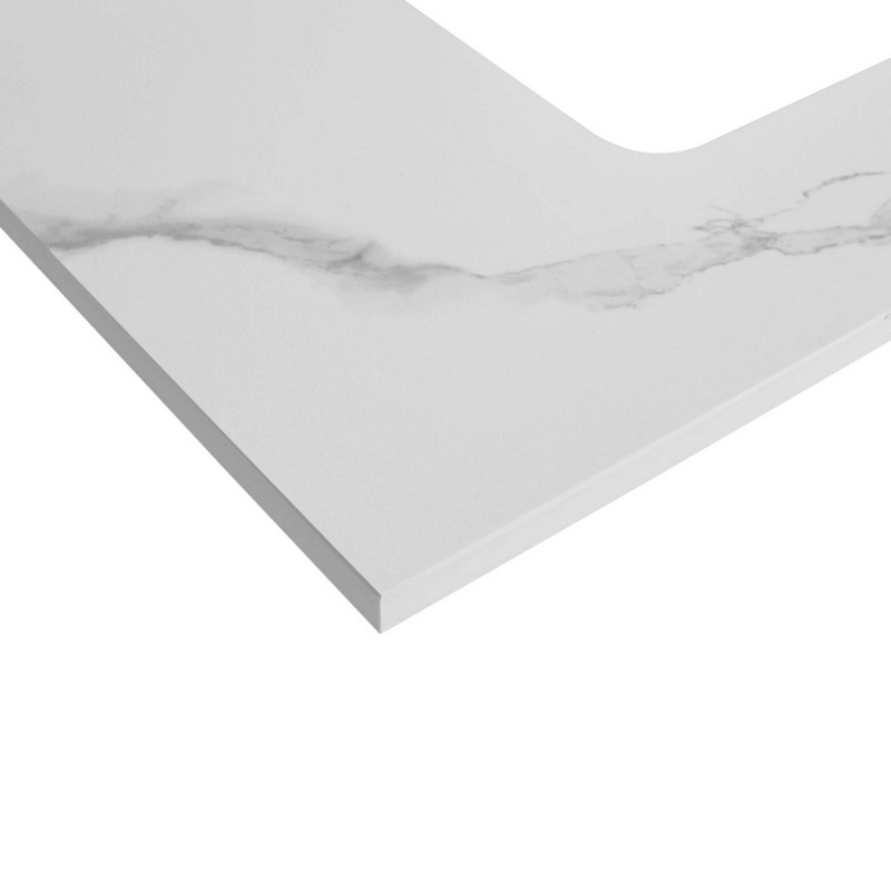 A genuine slab of Sintered Stone Carrara lends a white glove appeal to those that seek original stone as a stationary feature to any powder room. Durable to accommodate hot and cold elements, the entire surface is non-porous and includes signature crafting of single sink cutouts.