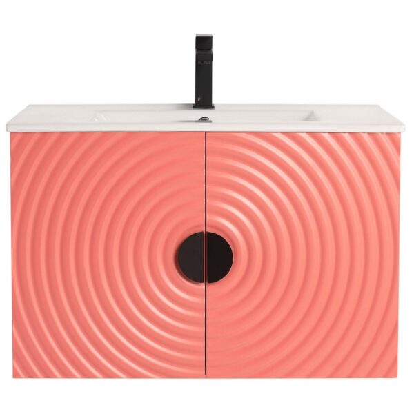 The PELLABAY vanity collection brings a contemporary flair to any bathroom with its unique, textured design. Featuring a bold, circular pattern on the cabinet doors, this collection combines visual appeal with functionality. The clean, minimalist shape of the vanity creates a modern aesthetic, while the smooth finish adds a sleek touch. Perfect for those looking to make a statement in their space, the PELLABAY collection offers a stylish blend of form and practicality, elevating your bathroomโs design.
